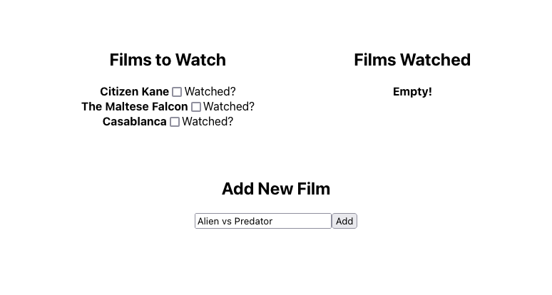 The example application built here shows two lists, one of films marked “To Watch” and another of films marked “Watched”. The interface then gives the user the ability to add new films and change film statuses.